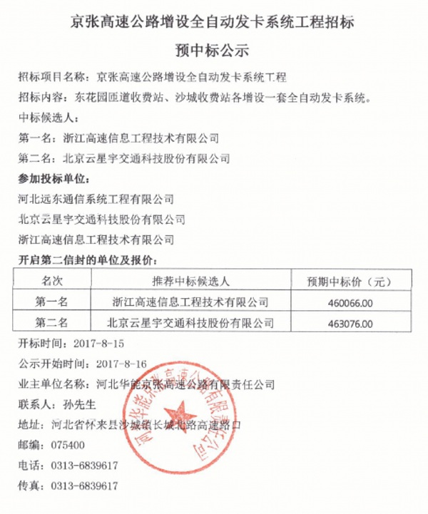 京張高速公路增設(shè)全自動發(fā)卡系統(tǒng)工程招標(biāo)預(yù)中標(biāo)公示