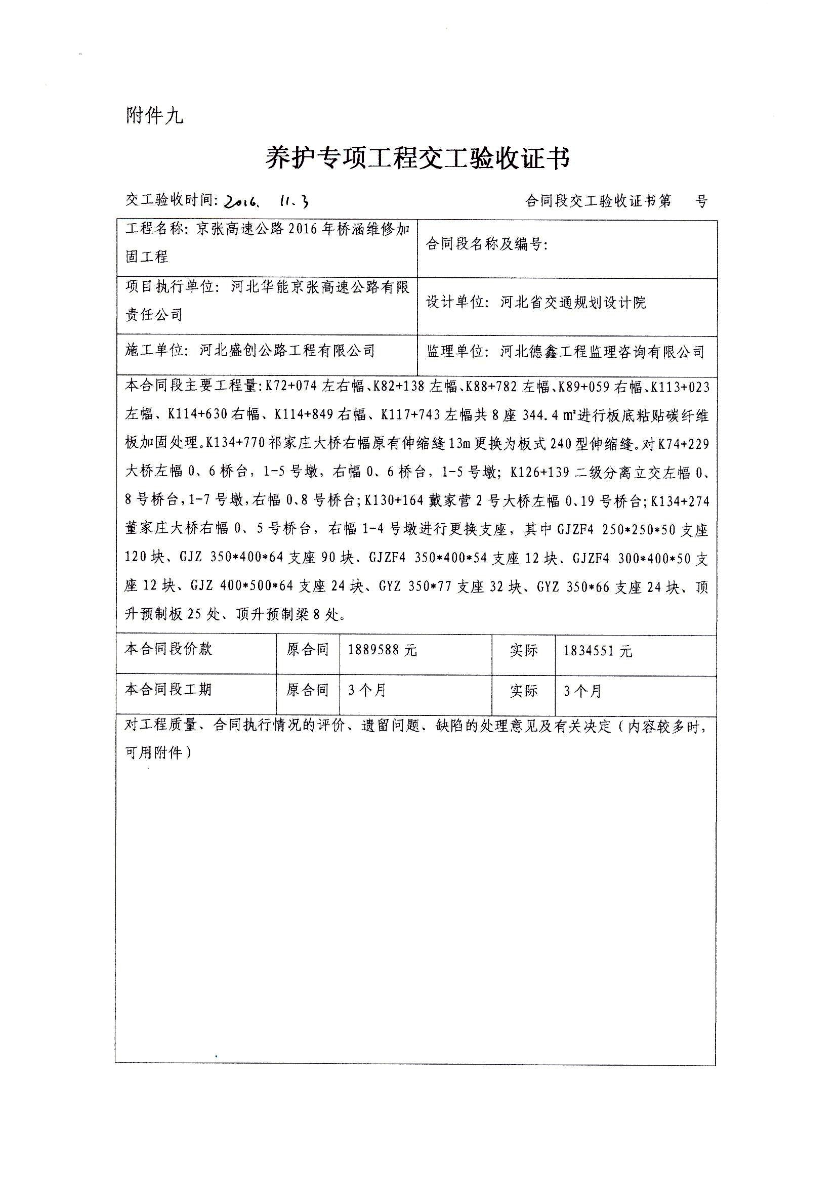 京張高速公路2016年橋涵維修加固工程交工驗收證書